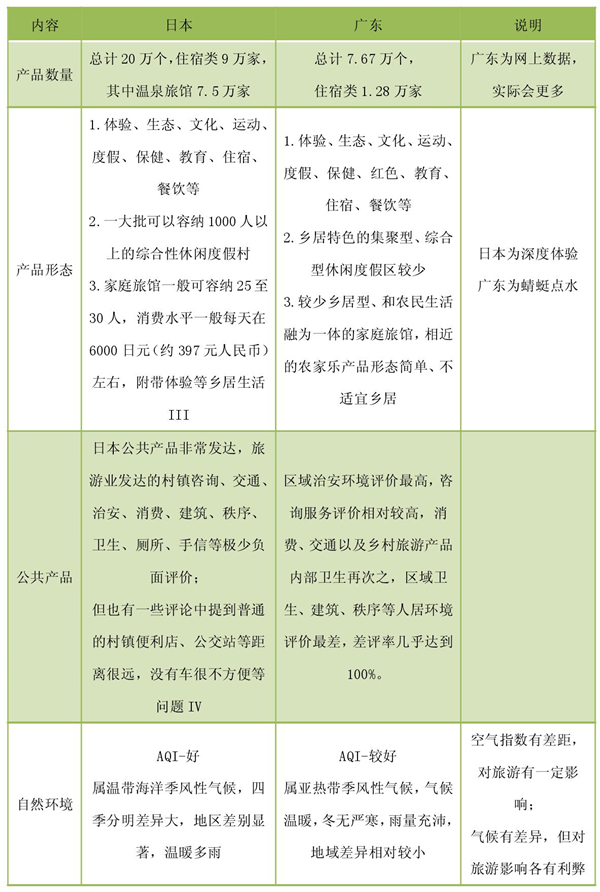 从数量上看,广东乡村旅游产品数量少,不到日本的4成;从类型、结构上看,日本是以乡居产品为主体,注重深度乡居体验,广东在乡居型产品、以及集聚型、综合型产品差距巨大;从区域旅游整体环境来看,广东区域卫生、建筑、秩序、空气等人居环境、以及消费、交通、甚至治安、咨询服务环境等都有巨大或明显的差距。