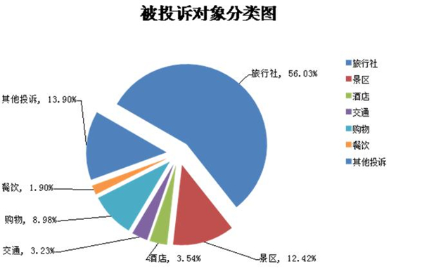 从被投诉对象来分析,对旅行社的投诉仍是重点。数据显示,第一季度,投诉旅行社1092宗,占受理投诉总数的56.03%,其中线下旅游投诉497宗,在线旅游投诉595宗。投诉景点242宗,占投诉总数的12.42%,投诉购物175宗,占投诉总数8.98%,投诉酒店69宗,占投诉总数3.54%,投诉交通63宗,占投诉总数3.23%,投诉餐饮17宗,占投诉总数1.90%,其它投诉271宗,占投诉总数13.90%。