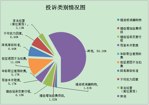 按投诉类别划分,投诉热点主要集中在:投诉旅行社拒签后退团不当扣费、降低等级标准、因不可抗力因素、擅自变更行程、导游未尽职责、强迫或诱骗购物和非法经营(黑社黑导)等问题上。其他投诉主要是签证、出境游押金、预定酒店等问题引发投诉。数据显示,投诉旅行社在游客出国旅游被拒签后,拒签退团不当扣费138宗,占全部投诉的11.69%;降低等级标准76宗,占全部投诉6.44%;因不可抗力因素76宗,占全部投诉的6.44%;擅自变更行程72宗,占全部投诉的6.10%;导游未尽职责61宗,占全部投诉的5.17%;非法经营(黑社黑导)37宗,占全部投诉的3.13%;强迫或诱骗购物19宗,占全部投诉的1.61%;擅自增加自费项目12宗,占全部投诉的1.02%;年龄职业差别收费2宗,占全部投诉的0.17%;其他投诉688宗,占全部投诉58.26%。