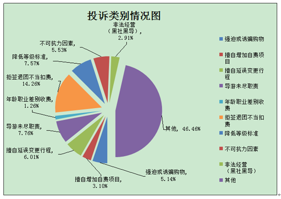 按投诉类别划分,投诉热点主要集中在:投诉旅行社拒签后退团不当扣费、降低等级标准、因不可抗力因素、擅自变更行程、导游未尽职责、强迫或诱骗购物和非法经营(黑社黑导)等问题上。其他投诉主要是签证、出境游押金、预定酒店等问题引发投诉。数据显示,投诉旅行社在游客出国旅游被拒签后,拒签退团不当扣费147宗,占全部投诉的14.26%;导游未尽职责80宗,占全部投诉的7.76%;降低等级标准78宗,占全部投诉7.57%;擅自变更行程62宗,占全部投诉的6.01%;因不可抗力因素57宗,占全部投诉的5.53%;强迫或诱骗购物53宗,占全部投诉的5.14%;擅自增加自费项目32宗,占全部投诉的3.10%;非法经营(黑社黑导)30宗,占全部投诉的2.91%;年龄职业差别收费13宗,占全部投诉的1.26%;其他投诉479宗,占全部投诉46.46%。